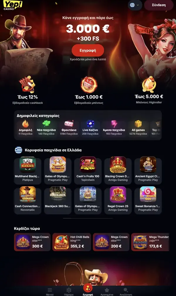 | Φρουτάκια | Λόμπι φρουτάκια Yep με χιλιάδες τίτλους | Τα τυπικά RTP στα φρουτάκια είναι γύρω στο 95% (δεν υπάρχει δημόσιος έλεγχος για όλα τα παιχνίδια) |
